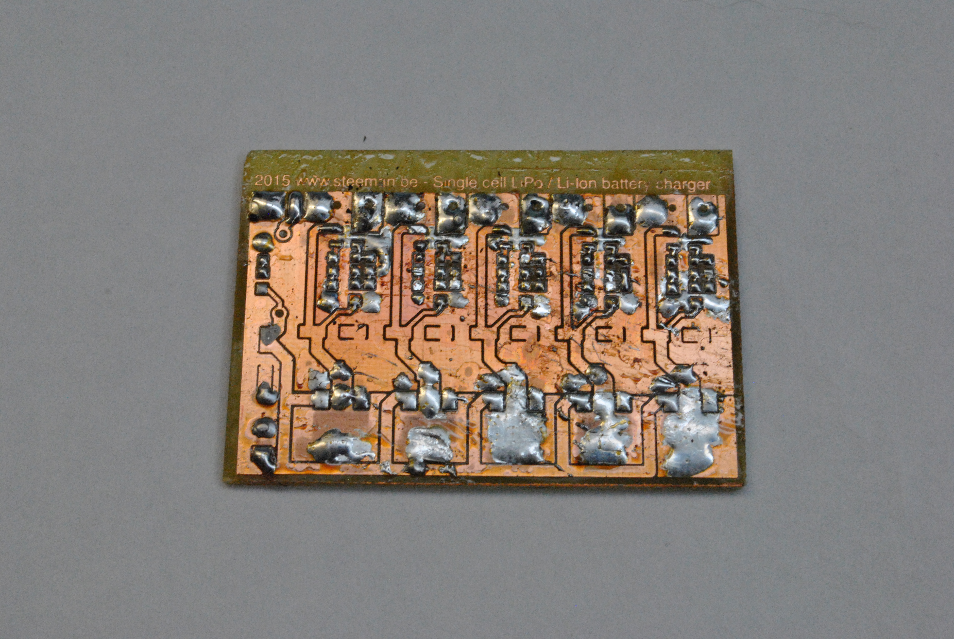 Here the board is charging 5 Li-Ion batteries. At 1020mAh 3.7V each, the charger in total pulls about 1.5A at 6.3V supply voltage. By the way, I didn’t have much success with these batteries (Nokia BLC-5C 1020mAh 1S Li-Ion) powering my Syma X5 quadcopter, flight time is about 20 seconds on each battery. Probably my batteries are just too old, or otherwise Li-Ion isn’t a great battery chemistry to power quads…