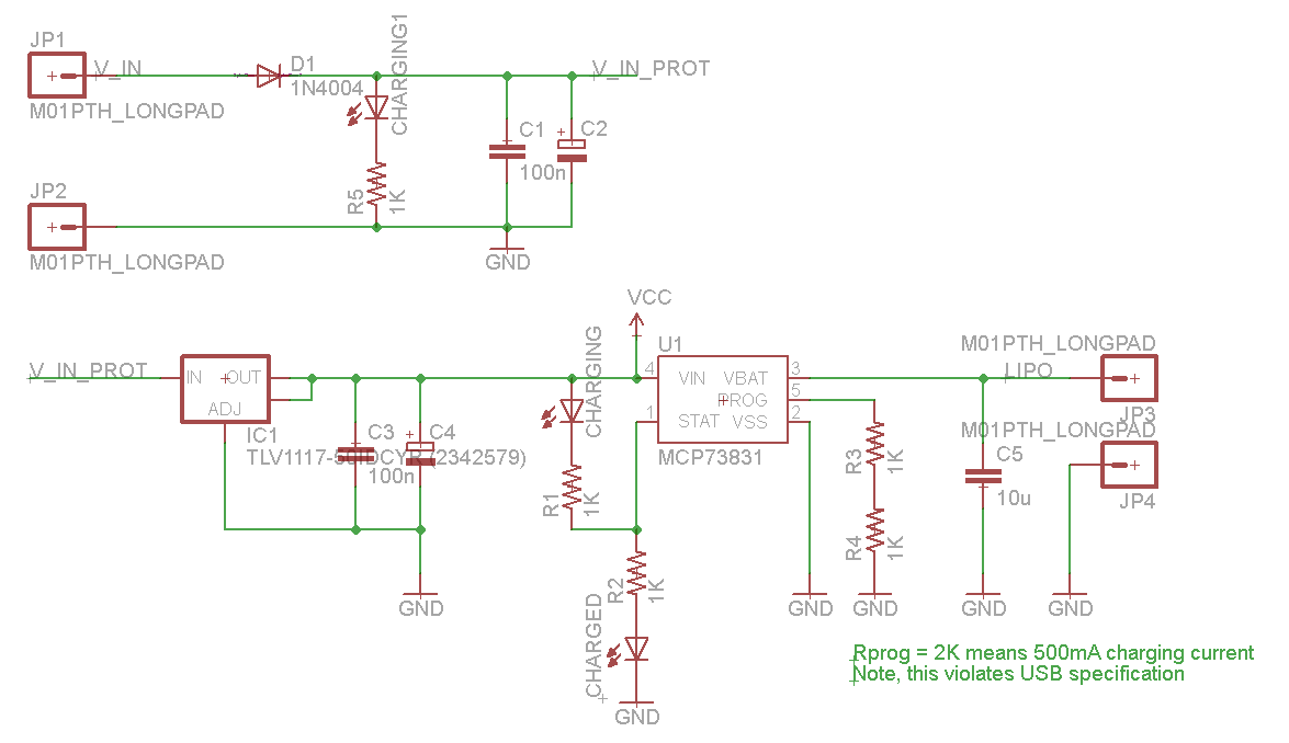 The CHARGING and CHARGED LEDs provide a visual indication of the charging status. Resistors R3 and R4 set the charging current, 500mA in this case.