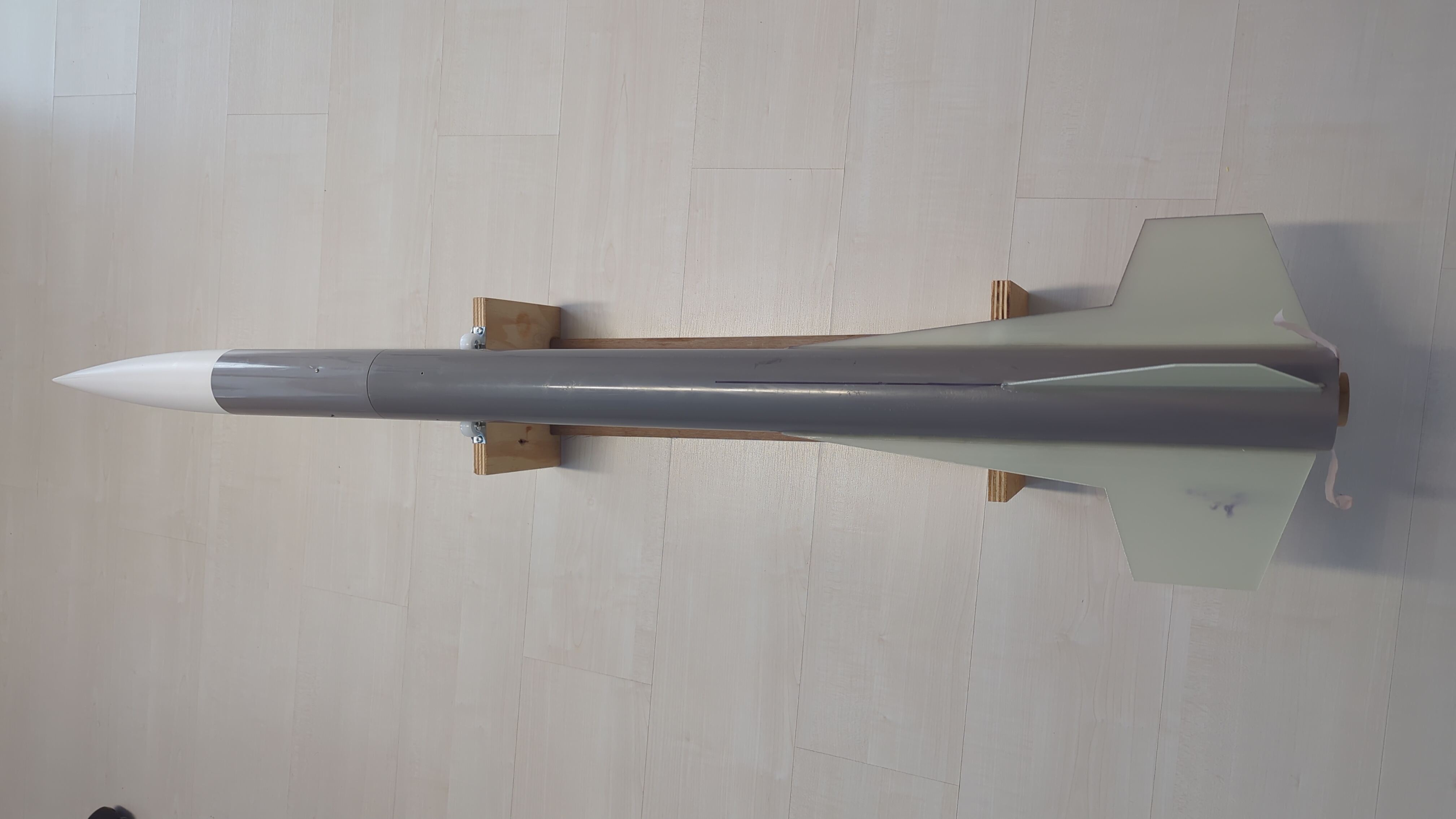 The kit came without decals, so I redesigned the old PML logo in Inkscape. I applied the custom decals using waterslide decal paper and clearcoated over them for protection. The high-visibility color scheme helps with visual tracking during flight and locating the rocket after landing.