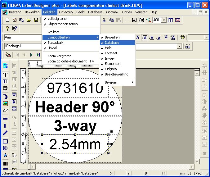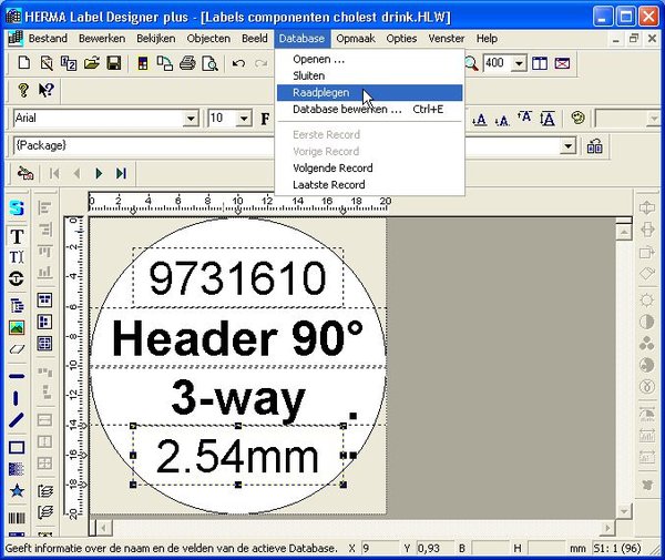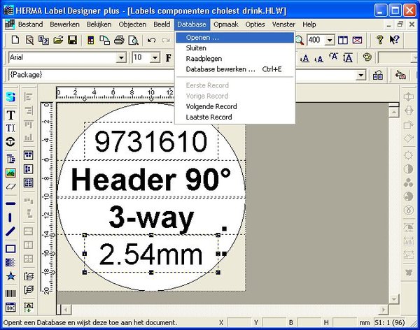 If we attempt to print this label, we’ll end up with a sheet full of this same label. To print one label for each line in our Excel sheet, we’ll have to link the Excel file to the labels. This is done in the Database menu in Herma Label Designer.