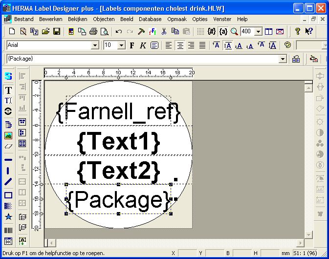 For the import from the Excel file to work, we’ll need to replace the text that we entered in the text fields by the labels which were provided to us in the previous window. We’ll need to put them between accolades so that they can be distinguished as labels instead of just text. This will tell Herma Label Designer which column to put in which text field on the label.