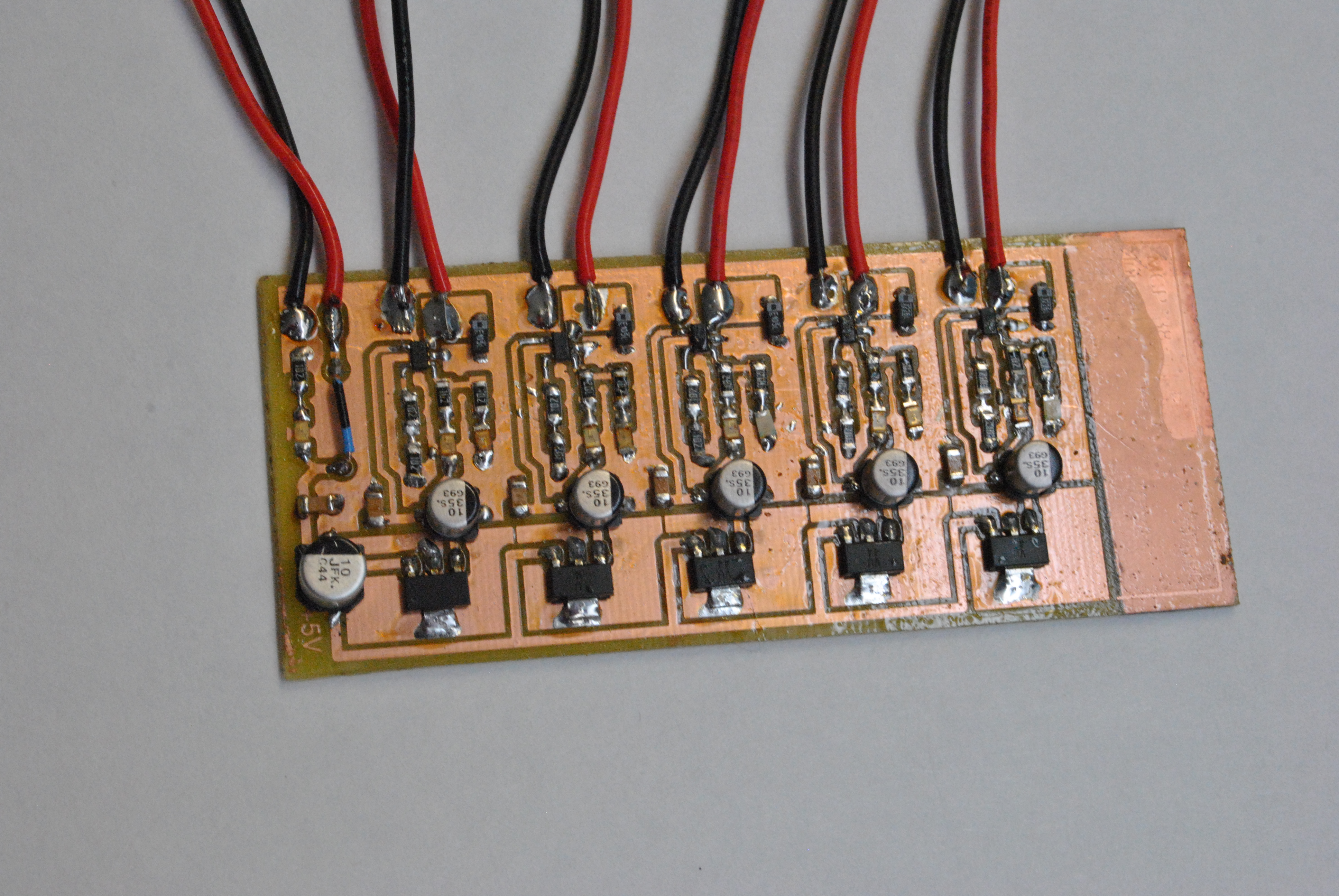 Of course I etched my PCB before doing a dry fit of the components on a print-out first, so I got what was coming to me: it turned out most of the passives copied over from another Eagle design file were 0603 instead of 1206. I made an honest attempt to solder on my 1206 components anyway to try to save the board, but with a 12 mil isolated ground poor I had too many shorts. That wasn’t a big surprise so I took my losses, re-designed the board with proper 1206-sized footprints, and re-etched the board. Here’s my 0603 PCB after I de-soldered the components.