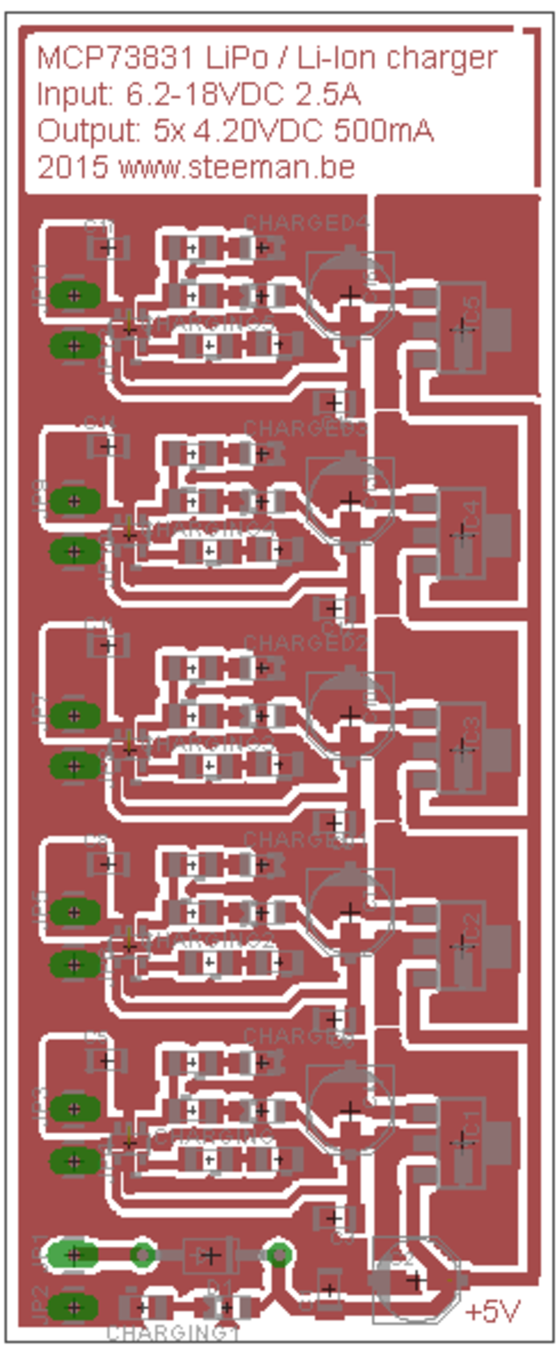 I plan on using a few spare Nokia Li-Ion batteries for my new quadcopter and was in need of a decent battery charger. This project can charge 5 single cell LiPo or Li-Ion (in my case Nokia BL-5C 1020mAh) batteries simultaneously from a single 6-20VDC power source. It is based on Microchip’s MCP73831 integrated charge management IC, which is powered through a 1117 5V regulator.