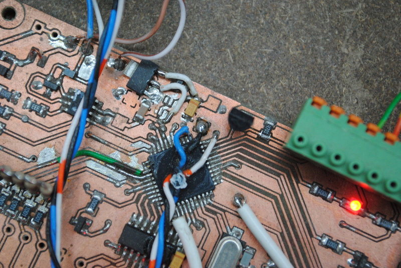 On a hardware level, the serial port needs to be connected to pin C6 on the microcontroller. Don’t forget to hook up ground as well. I soldered wires directly to the microcontrollers’ pins, in hindsight it would’ve been better if I had broken out these pins to test pads. You’ll notice that I have connected the RX pin (C7) as well, it’s not necessary but I decided to do it while I was in there soldering anyway. It might come in useful.