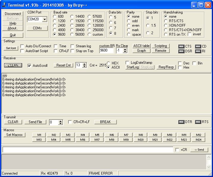 Next we’ll add some code in the existing init() function to initialize and open the serial port. This sets the port to 9600 baud, 8 data bits, 1 stop bit and no parity.