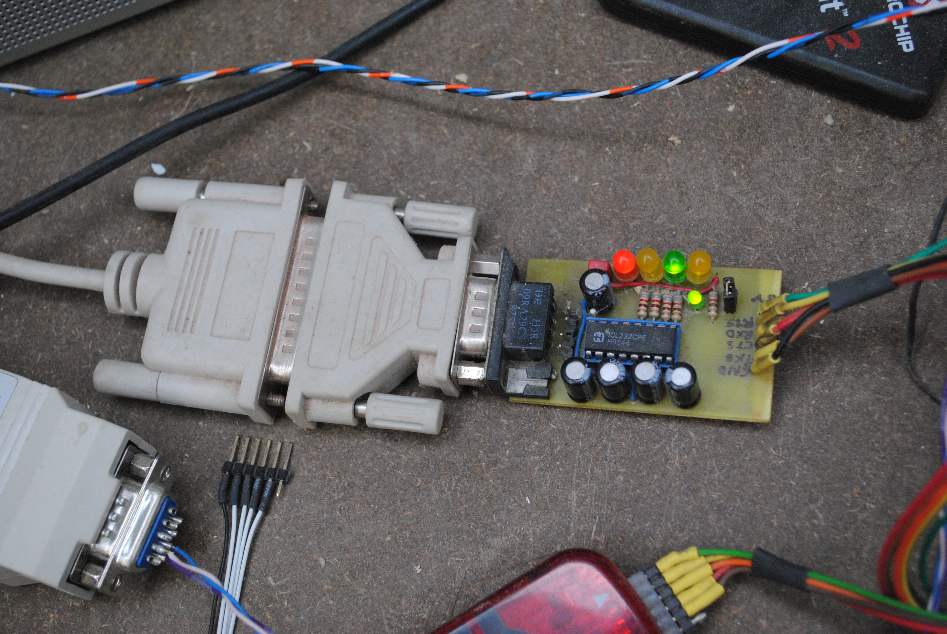 You’ll need to convert the signal levels from the TTL level as used by the microcontroller to RS-232 levels which the computer’s serial port needs. I hooked up a MAX232 breakout board which I made ages ago, these days it’s easier to get a pre-made serial-to-TTL converter board from eBay (such as those based on the Prolific PL2303HX or the FTDI FT232RL chip chips. Although in light of the issue with FTDI drivers that brick devices, it is perhaps better to stay away from FTDI chips.