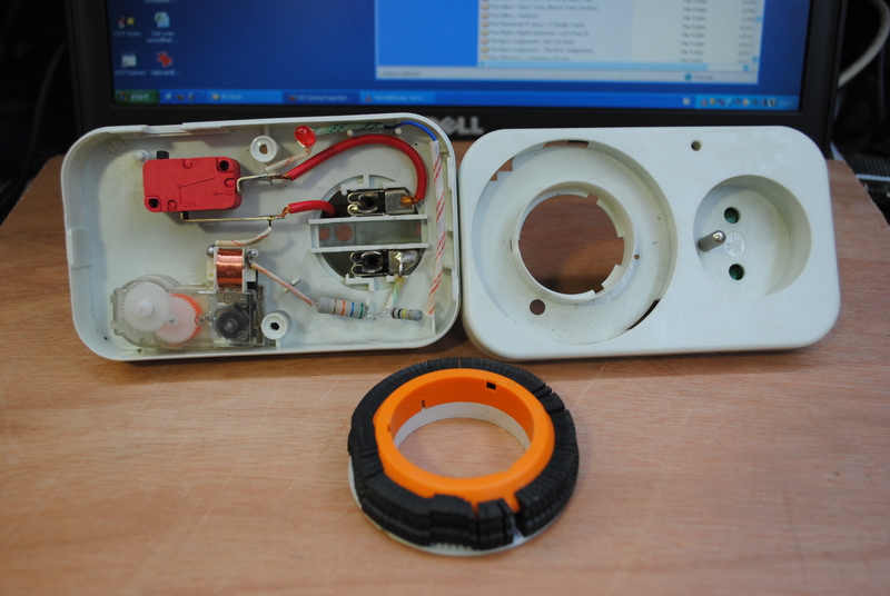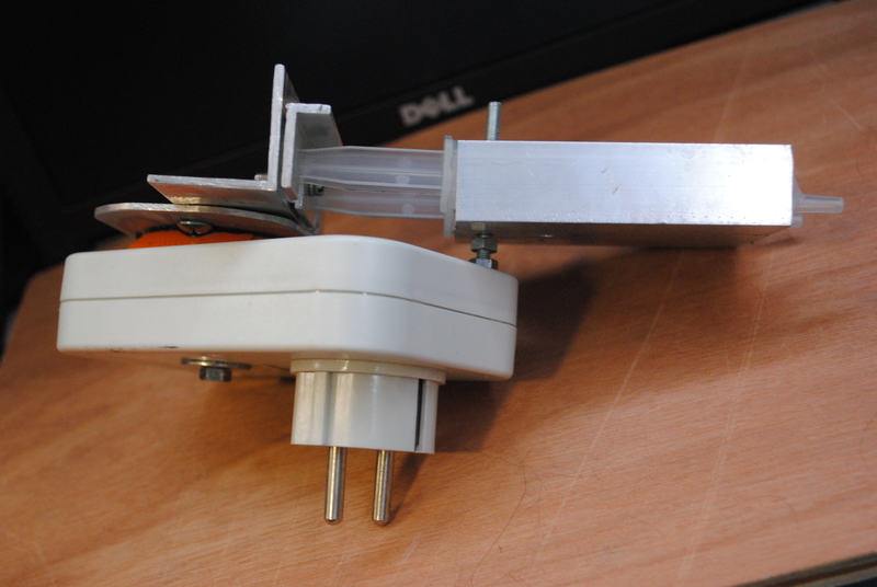 Since I have started adding fertilizers to my aquarium using the Estimative Index, I’ve found myself dosing 10ml of liquid into the tank 3 times a week. This gets old very soon, so I started thinking about a way to automatically add the correct dosage of liquid. Since all problems look like a nail if you have a hammer, I started thinking about syringes actuated by motor-driven threaded rod. When looking in my junk bin for a suitable timer to drive the motor, I found a simple 230V timer and realized that it already contained a small but heavily geared motor which turned on a daily cycle. So I decided to try and build a dosing pump out of it. This is the result.