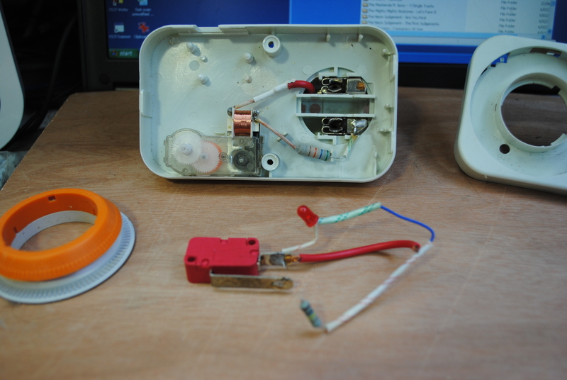 Then I opened the case and removed the microswitch and indicator LED, along with its resistor.