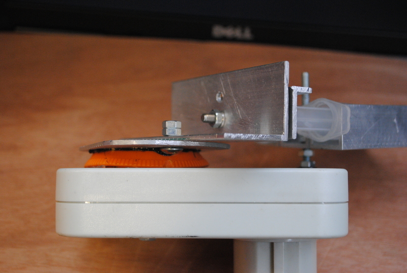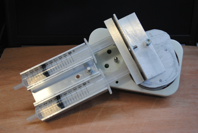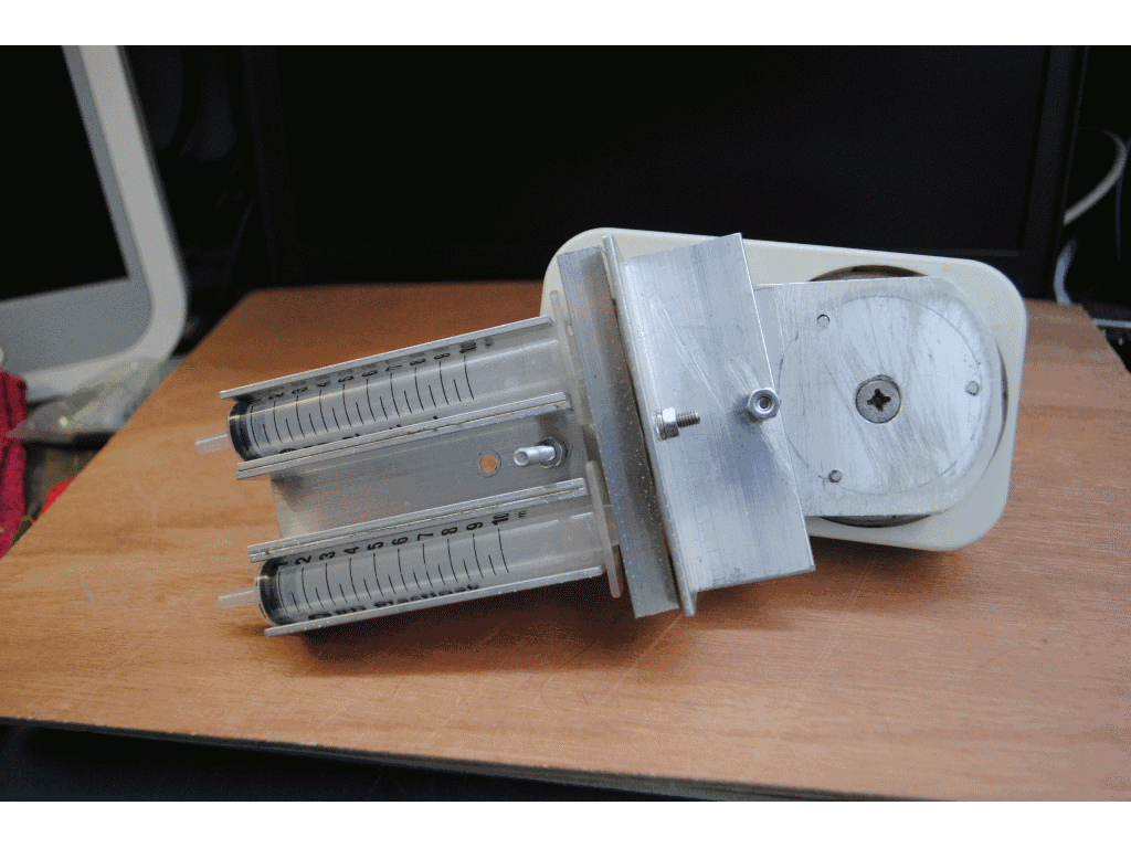 I then constructed a mounting bracket for the syringes out of angled aluminium channel, which conveniently has the correct inner dimensions to snugly hold 10ml syringes. I also made a clamp arrangement to hold the ends of the plungers. An aluminium plate was shaped roughly oval and screwed onto the timer’s revolving ring.