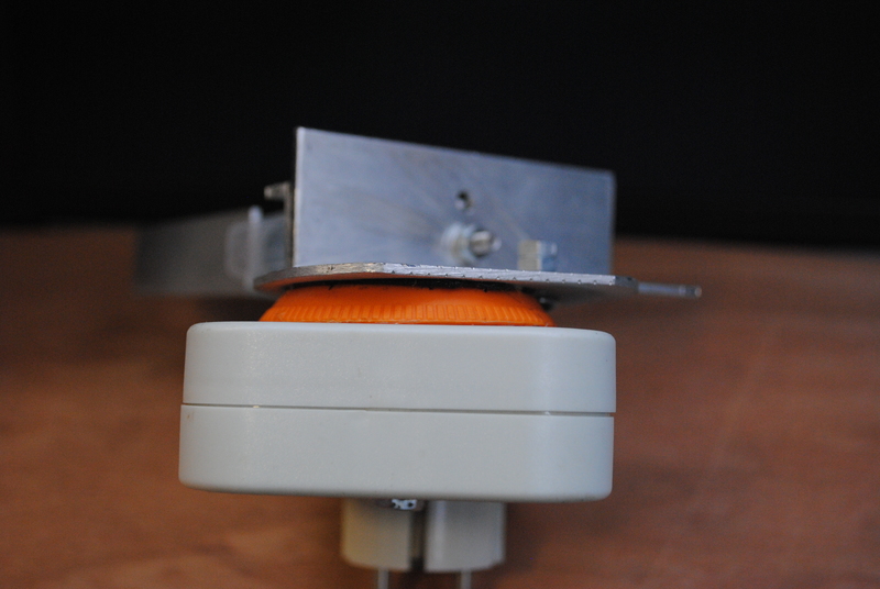 Lastly I drilled a hole into the oval alu plate and into the syringe holder, in such a way that the plungers actuated correctly. This is the critical step; get the location of these wrong and either the plungers will hit the end of the syringe (thus stalling the timer motor), or the plungers won’t extend far enough to fill to a correct dose. You’ll find that the travel of the plunger is equal to the diameter of the circle made by the mounting hole in the oval timer disc, and the mounting bracket hole should be positioned so that the plungers can fully retract.