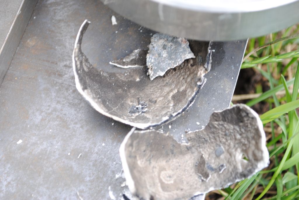 Er wordt vermoed dat deze laag afkomstig is van de rookgassen van de brandende Parabond, die gecondenseerd zijn tegen de (koelere) motorwand en deksel. Dit dient onderzocht te worden tijdens verdere tests. David stelt voor om eventueel een ander materiaal te gebruiken voor de coating, nl. een temperatuursbestendige elastische silicone of polymeer gebruikt om kachels af te dichten.