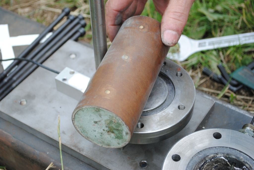 Aangezien tijdens de vorige test problemen opdoken met de opstelling van de BEM op een pallet, werden voor deze test een paar wijzigen aangebracht. De drukcel werd op een dikke stalen plaat bevestigd, waarin onder het uiteinde van de drukcel een uitdieping gefreesd werd om voldoende doorbuiging toe te laten. Deze stalen plaat werd op een stuk stevig staalprofiel bevestigd, hetwelk rechtstreeks op de grond geplaatst werd. Het profiel werd een beetje in de grond gedrukt zodat het stabiel werd.