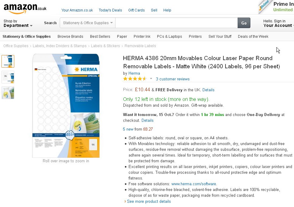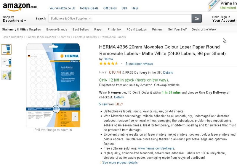 The labels I use are Herma brand, reference 4386. Each laser printable A4 sheet holds 96 round 20mm labels. Different stationary stores carry them.