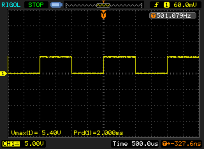 If we toggle a spare output pin inside the inpterrupt routine, we can check on the oscilloscope that our interrupt is indeed running at 1ms. Since we are toggling the pin in the interrupt, a full period of the waveform will need two passes through the interrupt routine. So we’ll need to devide the measured period by 2.