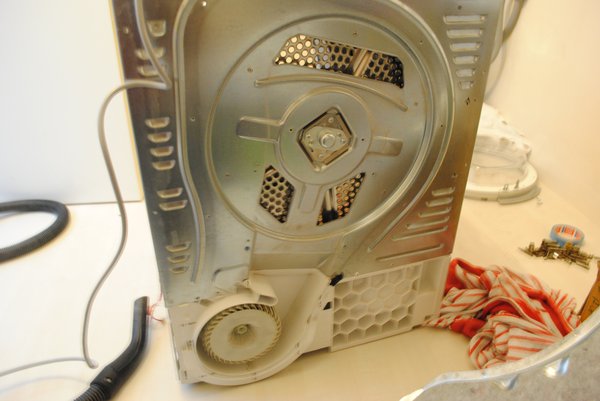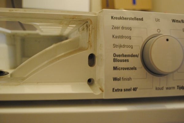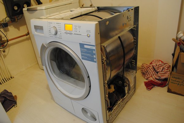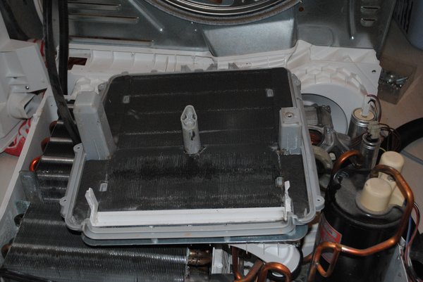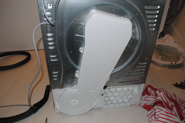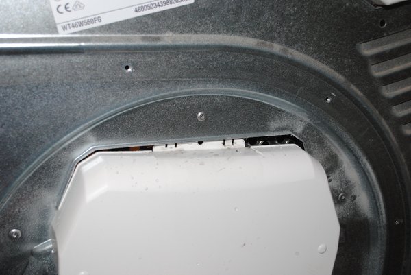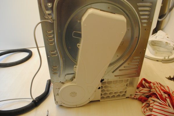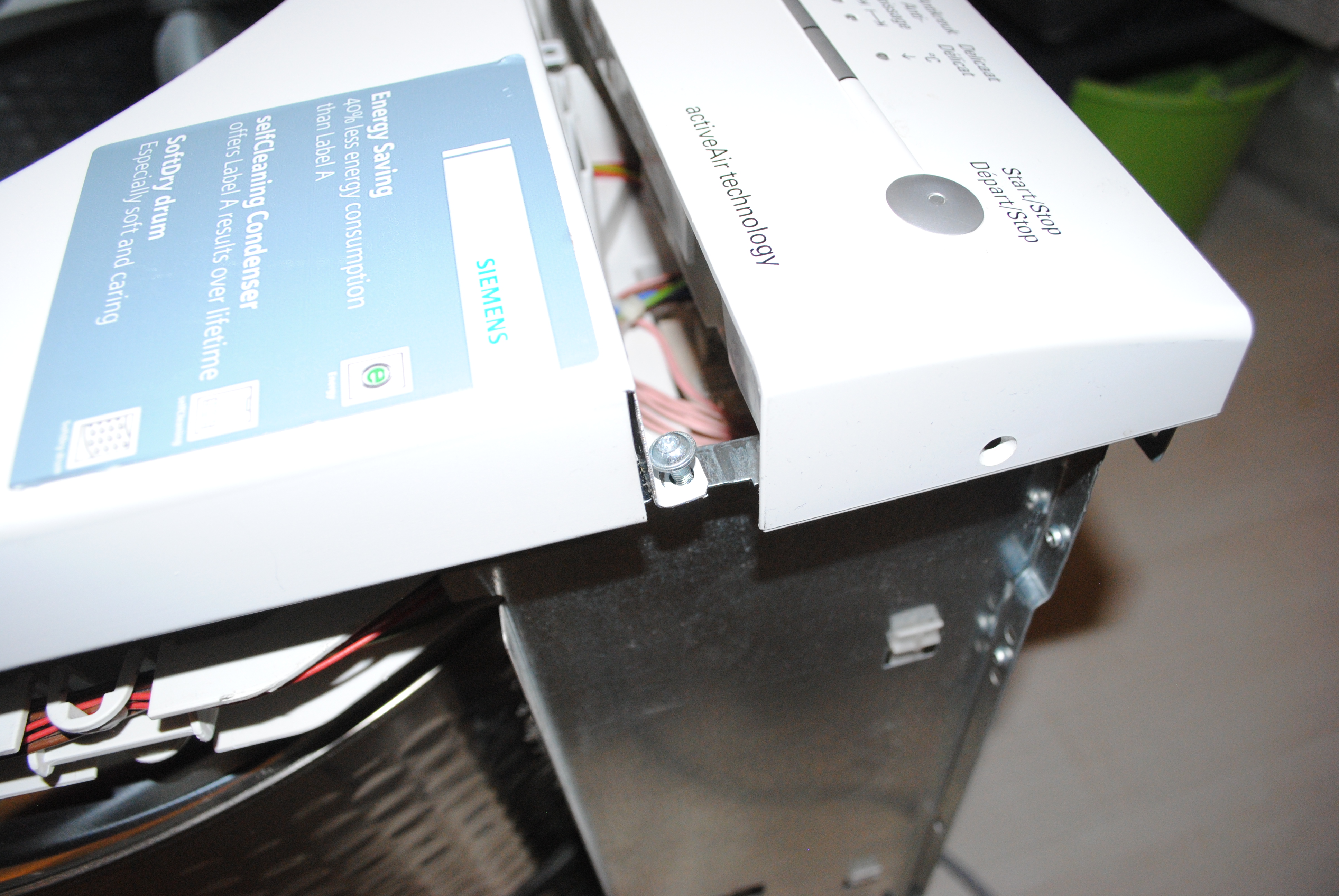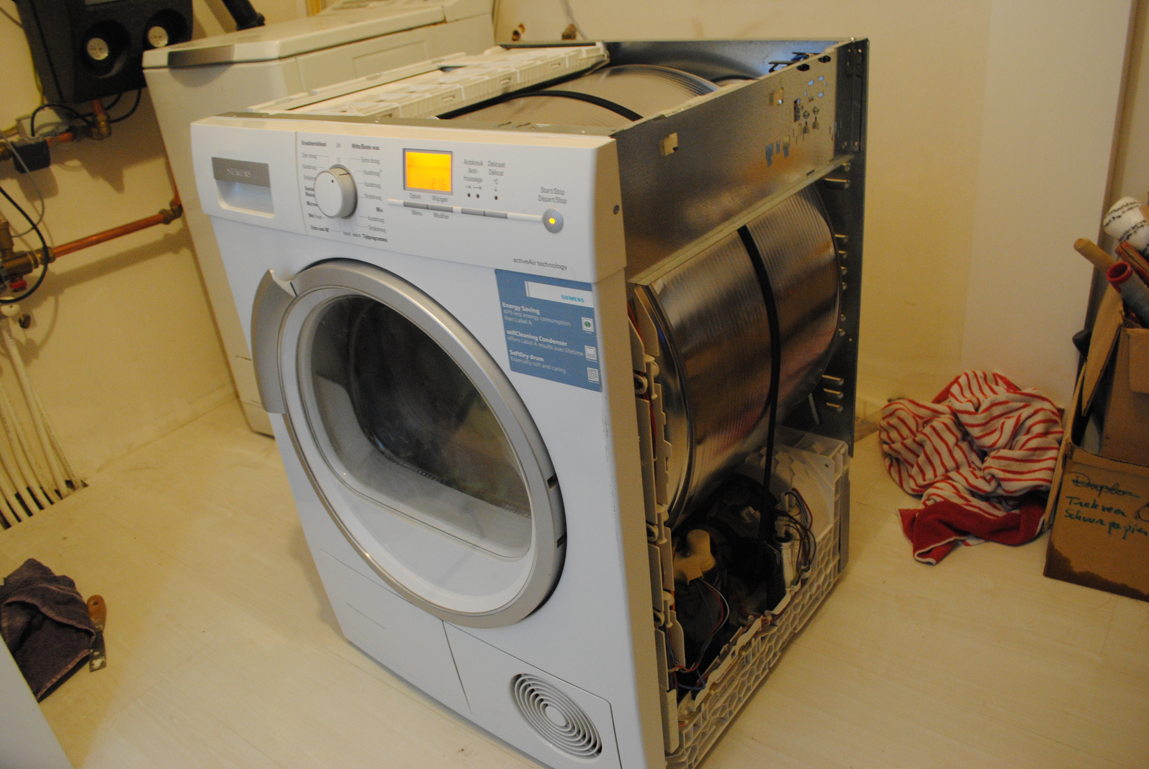 So my Siemens WT46W560FG clothesdryer stopped working. It gave an error signalling that the condensation tray was full, while in fact it wasn’t at all. Checking the internet reveals that this is a very common problem with this type of dryers, so much that it can be considered a design flaw. Siemens wanted over a third of the cost of a new machine to repair my 4-year old machine, so I said no and decided to investigate the problem myself. Turns out all is needed to get the machine running again is a (very) thorough clean. Here’s the pictures, should you be interested to do this yourself.