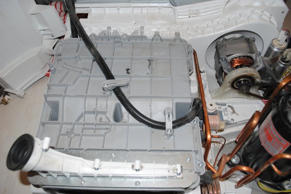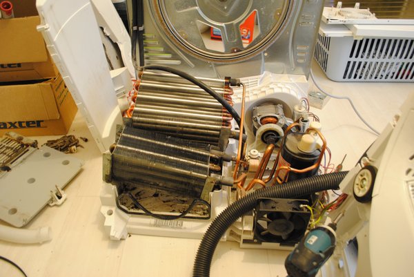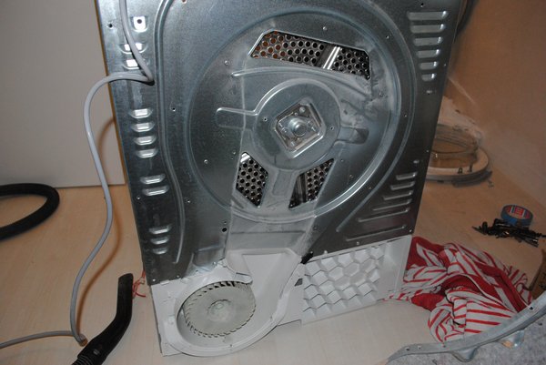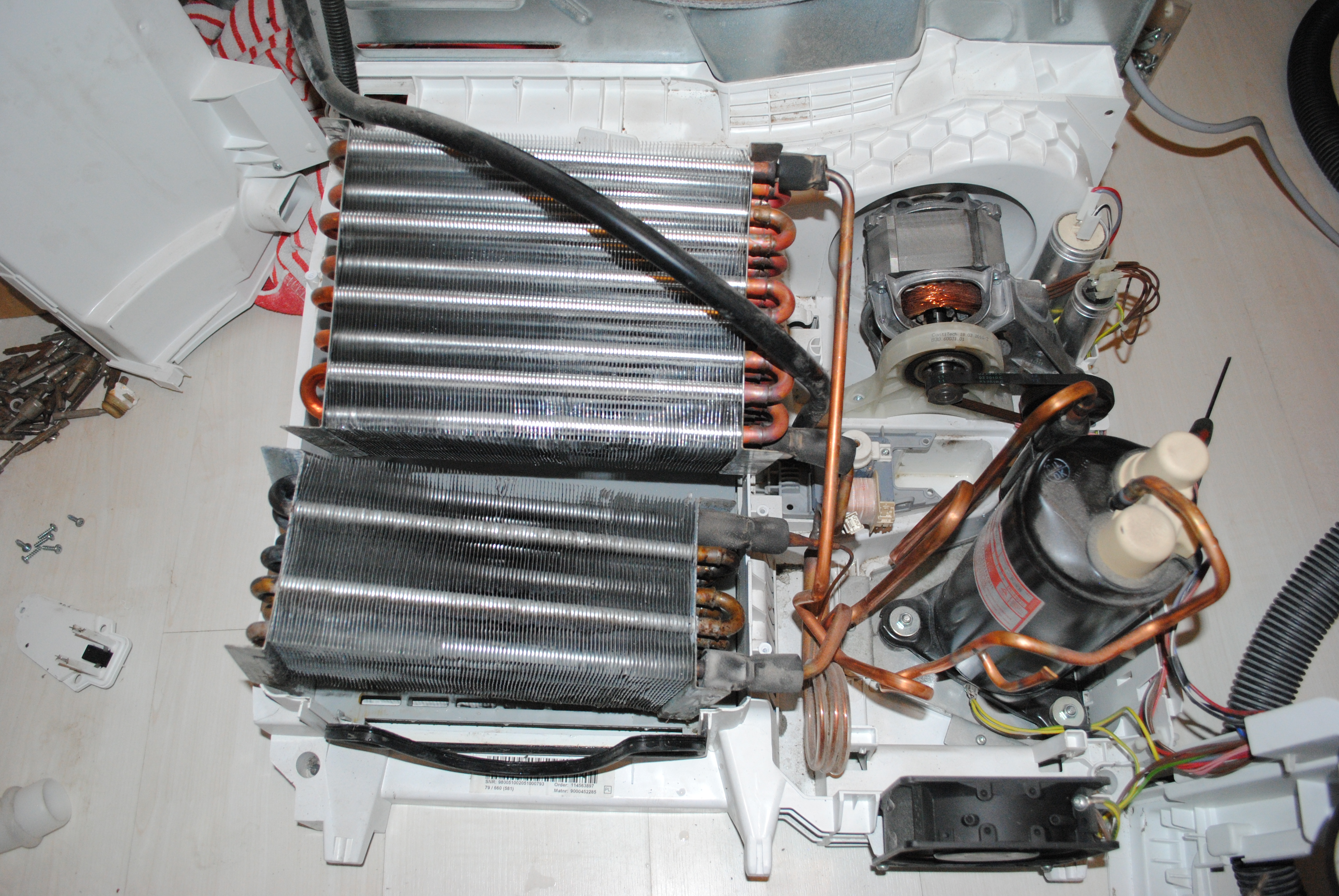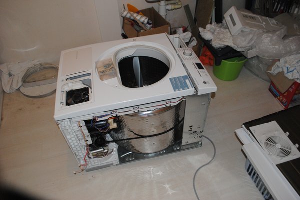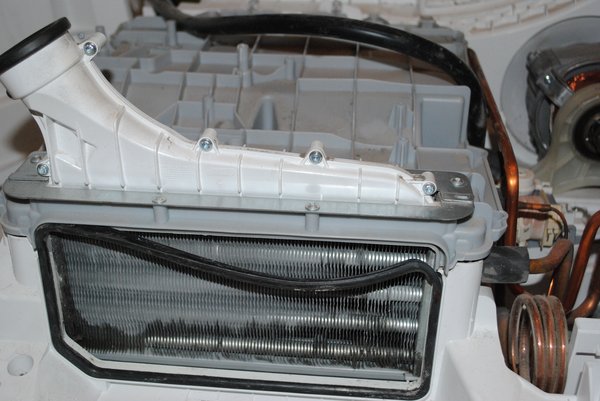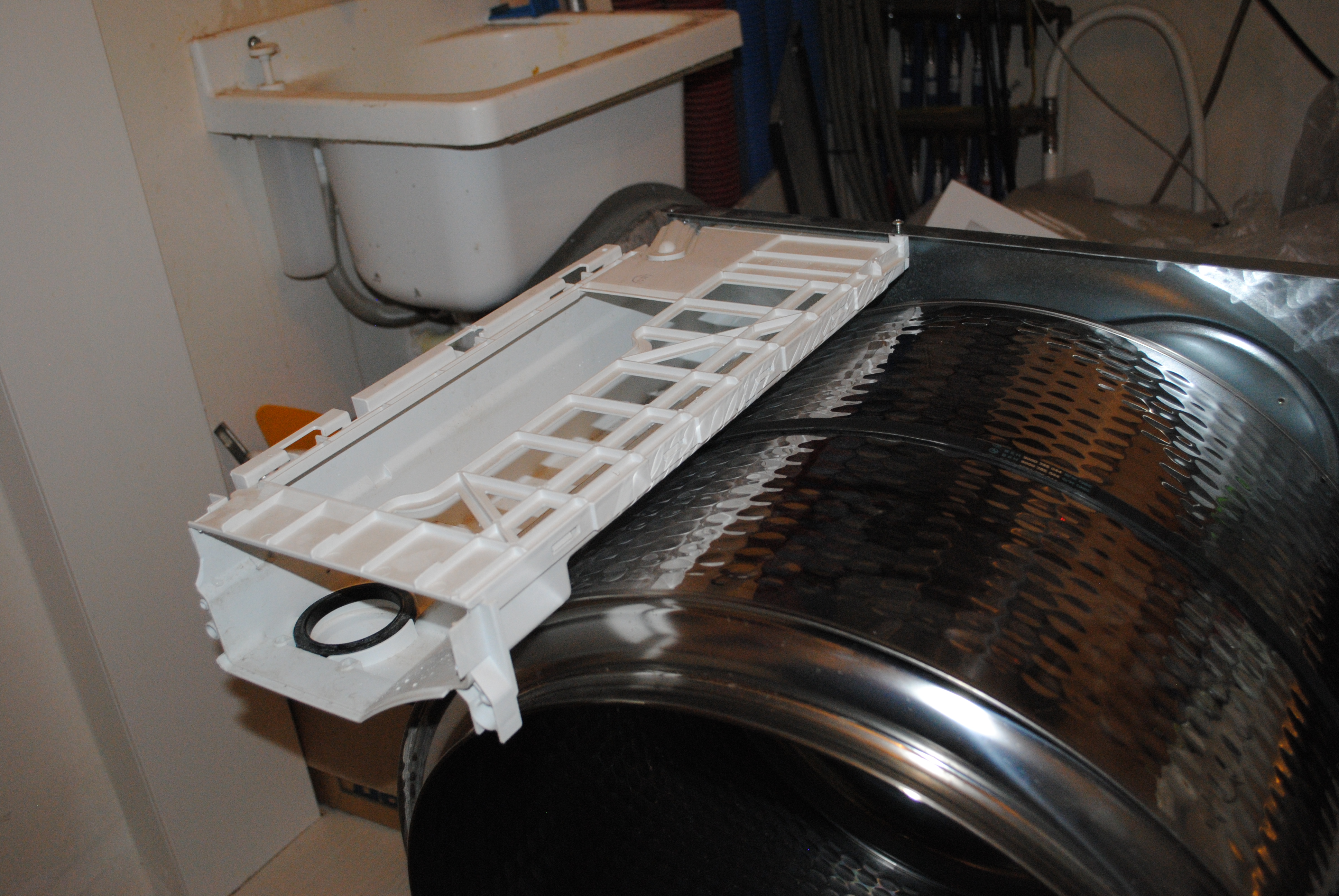 So my Siemens WT46W560FG clothesdryer stopped working. It gave an error signalling that the condensation tray was full, while in fact it wasn’t at all. Checking the internet reveals that this is a very common problem with this type of dryers, so much that it can be considered a design flaw. Siemens wanted over a third of the cost of a new machine to repair my 4-year old machine, so I said no and decided to investigate the problem myself. Turns out all is needed to get the machine running again is a (very) thorough clean. Here’s the pictures, should you be interested to do this yourself.