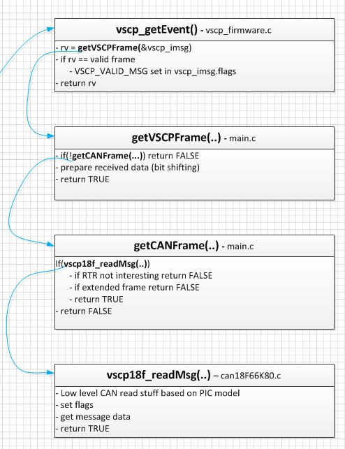 - getCANFrame() calls vscp18f_readMsg() , checks if it is a frame of interest and is not an extended frame.