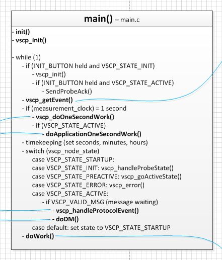The main() function calls the vscp_init() function and then goes into an infinite loop (while(2)), in which the following actions are taken: