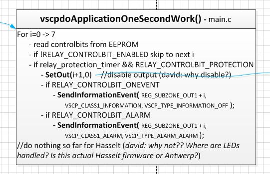 In this function, the actual application functionality is implemented. The functionality of the Hasselt node is limited to sending input button events and act upon events to set output pins based on received events and the Decision Matrix. Sending the input button events is handled elsewhere (xxx where?), asserting the outputs is done here.