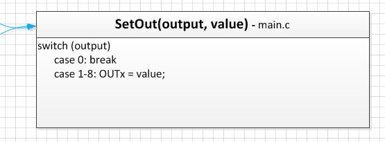 This function takes two arguments: the number of the output it should set, and the value which should be set. It then sets the OUTx variable to that value. OUTx are defined labels for the PIC’s latch registers LATybits.LATyx.