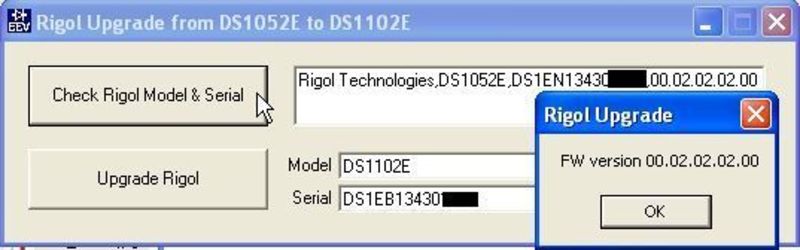 - Click the “Check Rigol Model & Serial” button, it will show you the *IDN? result and your FW version. (it will automatically fill the new model and serial number for upgrade process). Compare this to your original serial number to make sure it is correct.