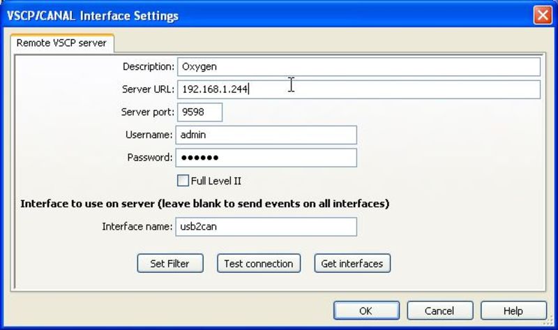 Fill in the IP address of the machine which is running the VSCP daemon. The server port is best left as default (9598), and if you have changed the username and password in the vscpd.conf file on the Linux machine, you should change them here as well. The default password is secret.