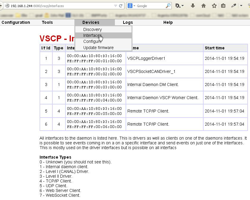 If you log on to the VSCP daemon web page (localhost:8080/vscp), the Devices - Interfaces menu should list the VSCPSocketCANDriver_1.