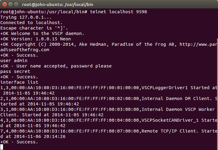 You should get a line that shows ‘ VSCPSocketCANDriver_1 Started ’.