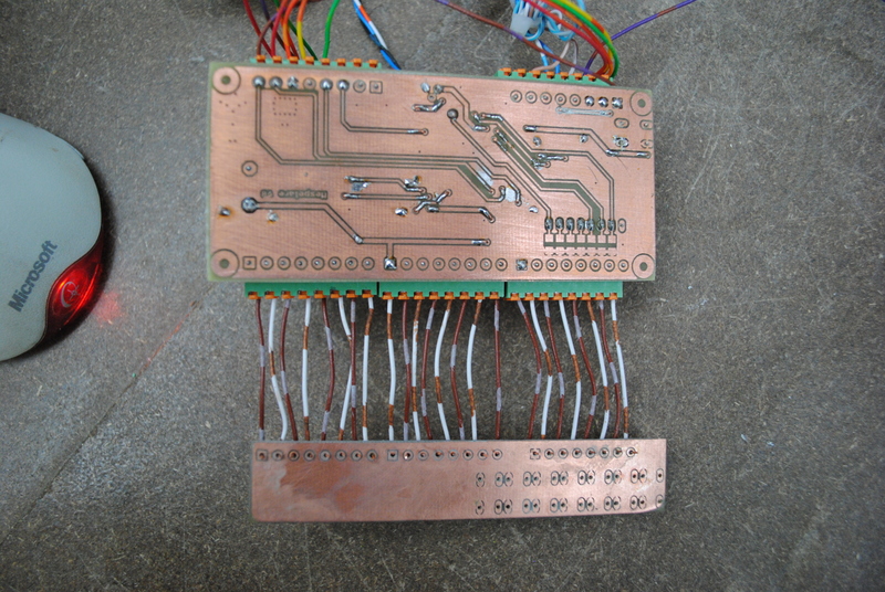 The PCB design was printed on a transparent laser sheet, transferred to a pre-sensitized PCB using a UV face tanner, developed in drain cleaner (NaOH) and subsequently etched. I populated the board by hand.