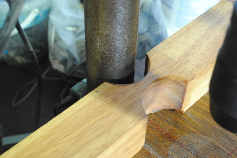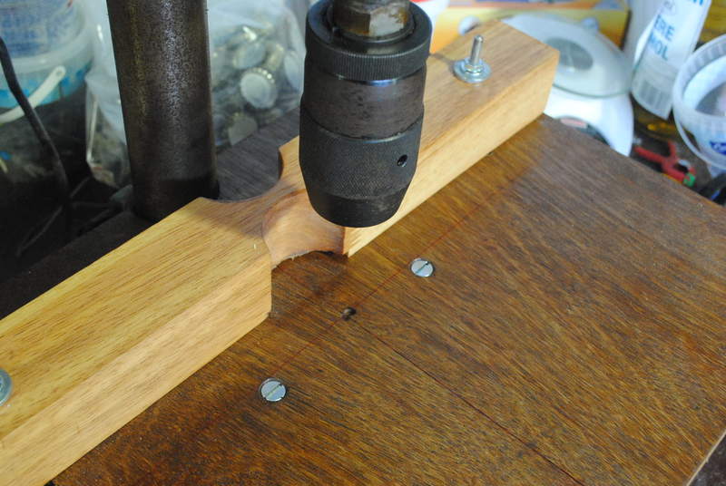 The fence has two rather large indentations. These were made on the new drill table with a hole saw.