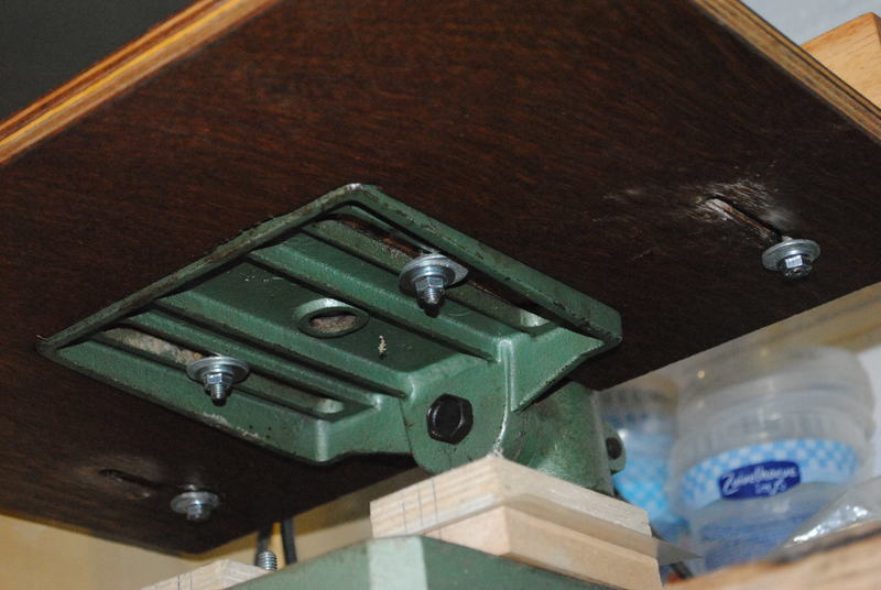 A routed recess was made in the bottom of the table so that it fit perfectly over the existing, smaller metal table. This way the metal table can be used for positioning the height of the new table and for fixing the new table to the column.