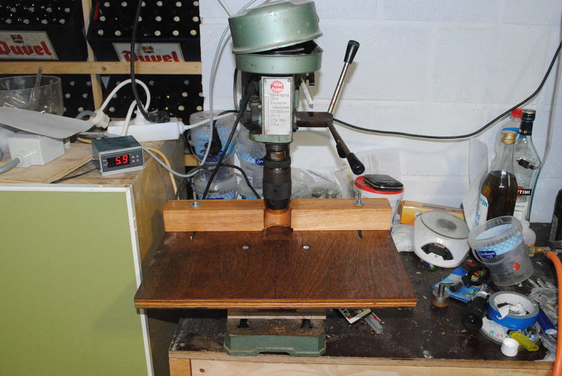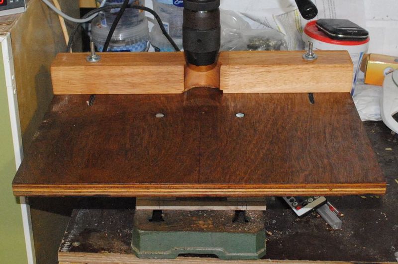 The table is made using a 430x310mm piece of 18mm multiplex board, the fence using a 430mm piece of 50x50mm piece of Rubberwood. The fence slides over the back half of the table. Once the fence is set to a fixed distance from the drill bit, it is easy to accurately drill multiple holes that same distance to the side of the workpiece.
