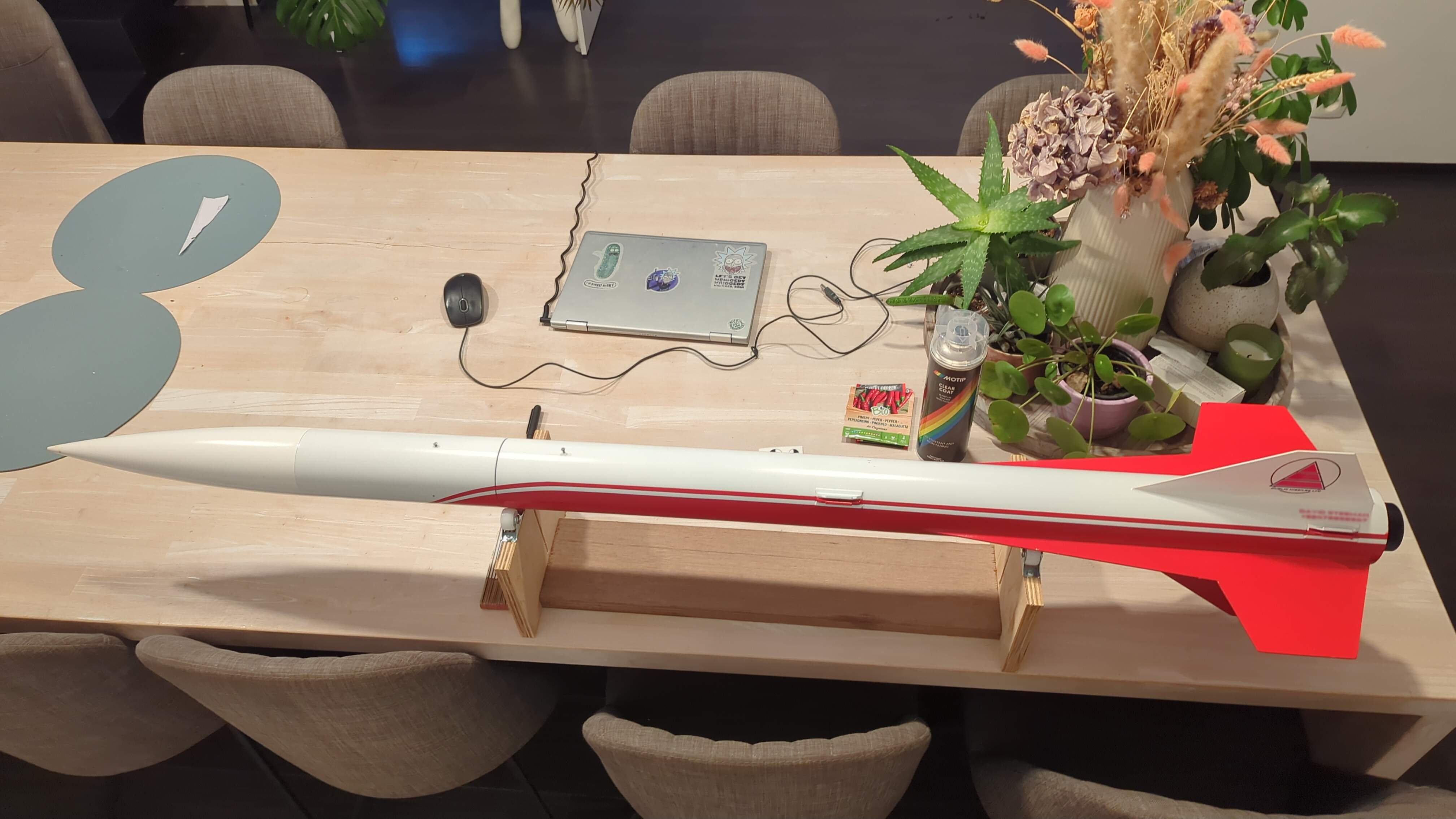 The kit came without decals, so I redesigned the old PML logo in Inkscape. I applied the custom decals using waterslide decal paper and clearcoated over them for protection. The high-visibility color scheme helps with visual tracking during flight and locating the rocket after landing.