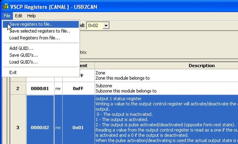 Side note: if VSCP-Works, at a later stage, fails to re-import the register file we just saved, it is because some versions of the Hasselt MDF contain 4 hex values with a Unicodemultiplication sign instead of a regular ASCII ‘x’. If you open the file with a good text editor (I use Notepad++) and do a search-and-replace then VSCP will be able to import the file.