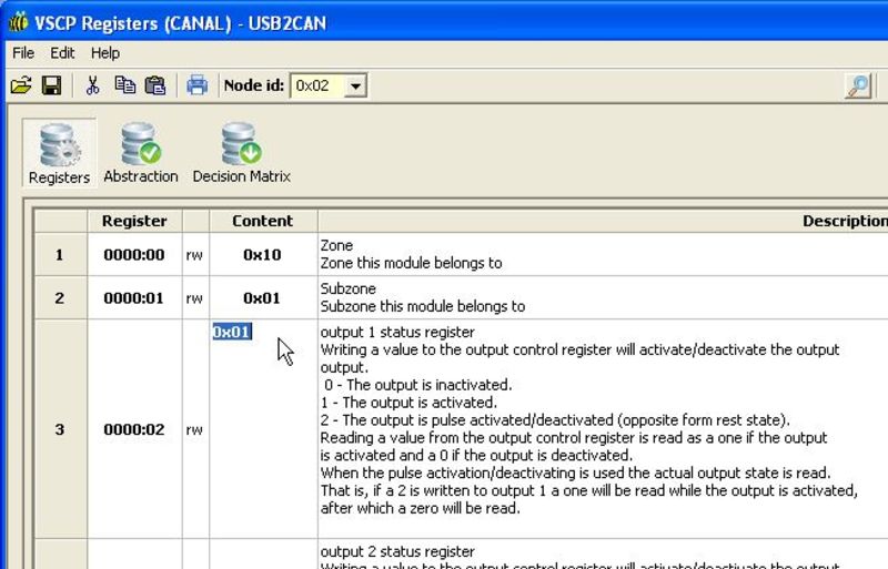 Now let’s attempt some updates to the registers. Now would be a good moment to read up on some of the general VSCP concepts such as the Decision Matrix, mask/filters etc. Check my post Getting started with VSCP for links to this information.