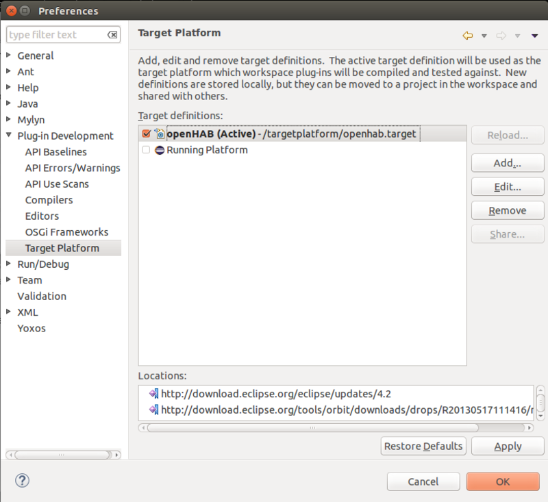 by selecting Window , Preferences , Plug-in Development , Target Platform , openHAB from the main menu.