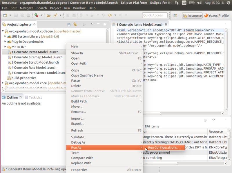 Go to the project org.openhab.model.codegen and run the prepared launch files. For each .launch file, select Run As , x Generate abc Model from the context menu. Please follow the order given by the numbers.