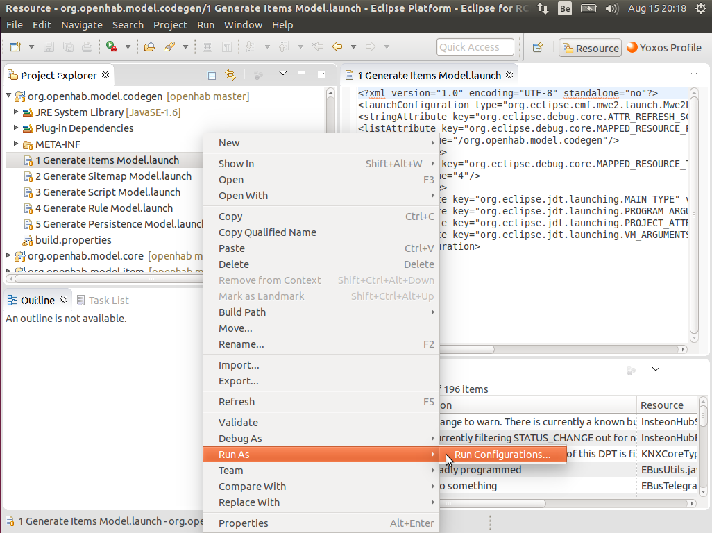 Go to the project org.openhab.model.codegen and run the prepared launch files. For each .launch file, select Run As , x Generate abc Model from the context menu. Please follow the order given by the numbers.