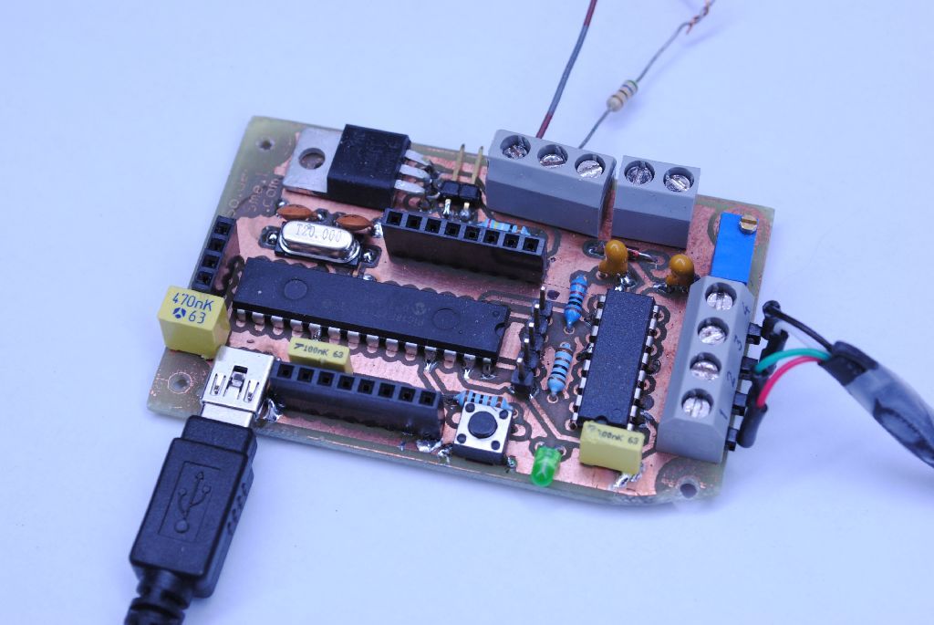 Op de print is een aansluiting voorzien voor een drukcel (load cell). Omdat de uitgang van een drukcel niet rechtstreeks in te lezen is, is ook een meetversterker voorzien. Deze meetversterker is de bekende INA125 van Burr-Brown. Hij heeft een interne referentiespanning aan boord waarmee de drukcel aangestuurd wordt, en versterkt de differentiële milli-volt spanning die uit de load cell komt tot een niveau dat geschikt is om ingelezen te worden door de microcontroller (0-5VDC). Met een multi-turn potmeter is de gewenste versterking in te stellen, zodat –in functie van de maximaal verwachte stuwkracht– het meetbereik van het systeem volledig kan benut worden.