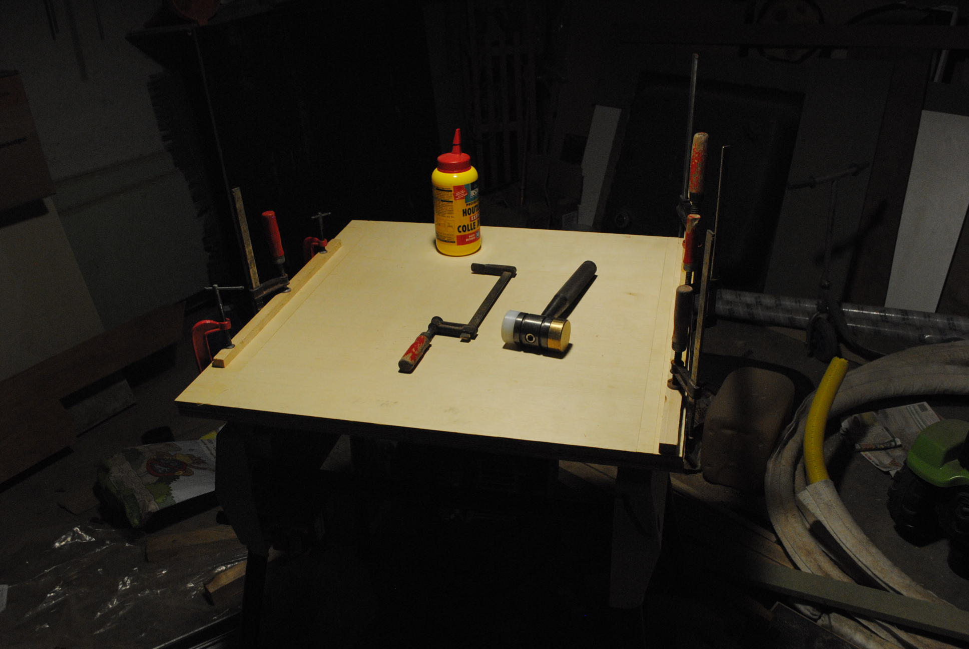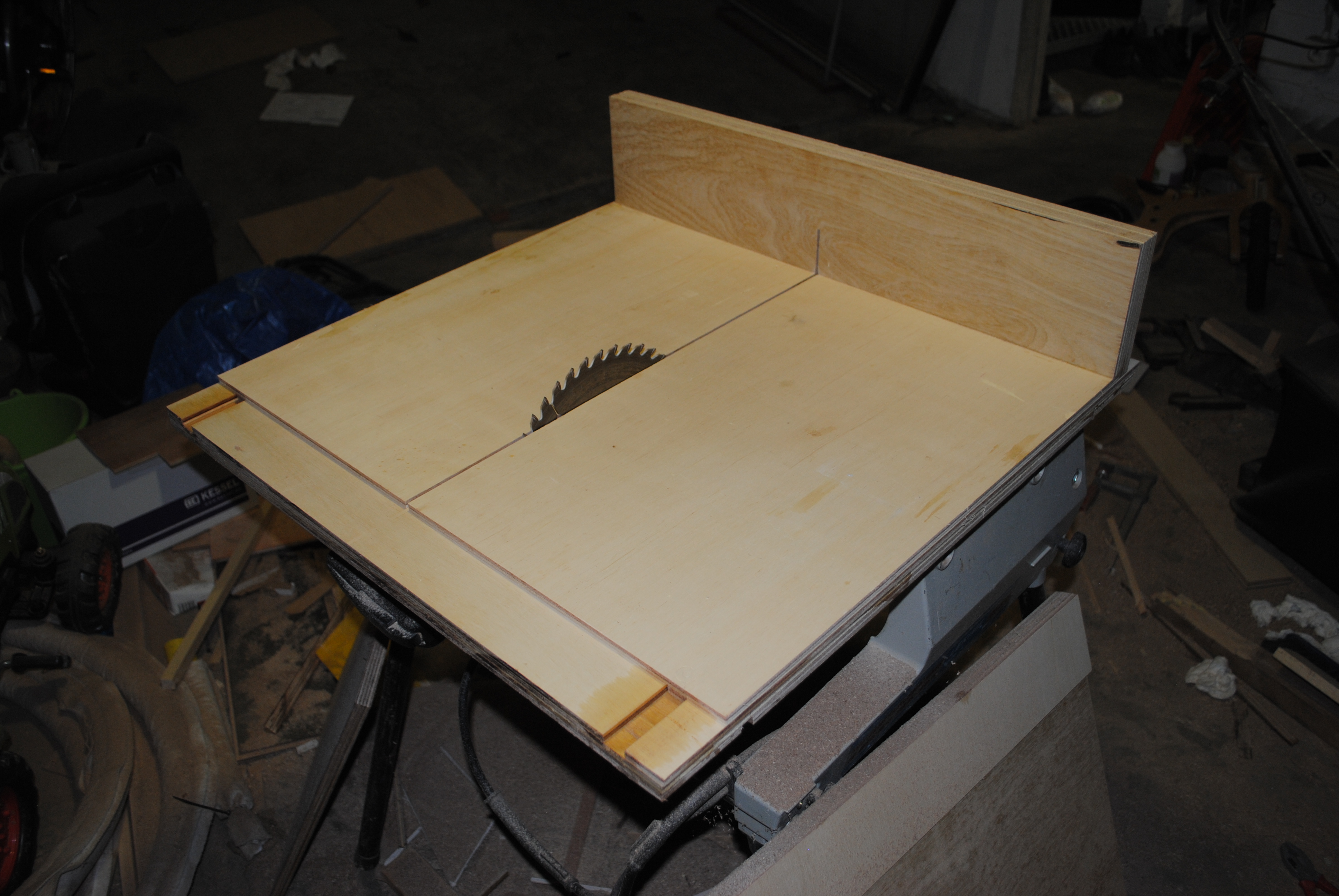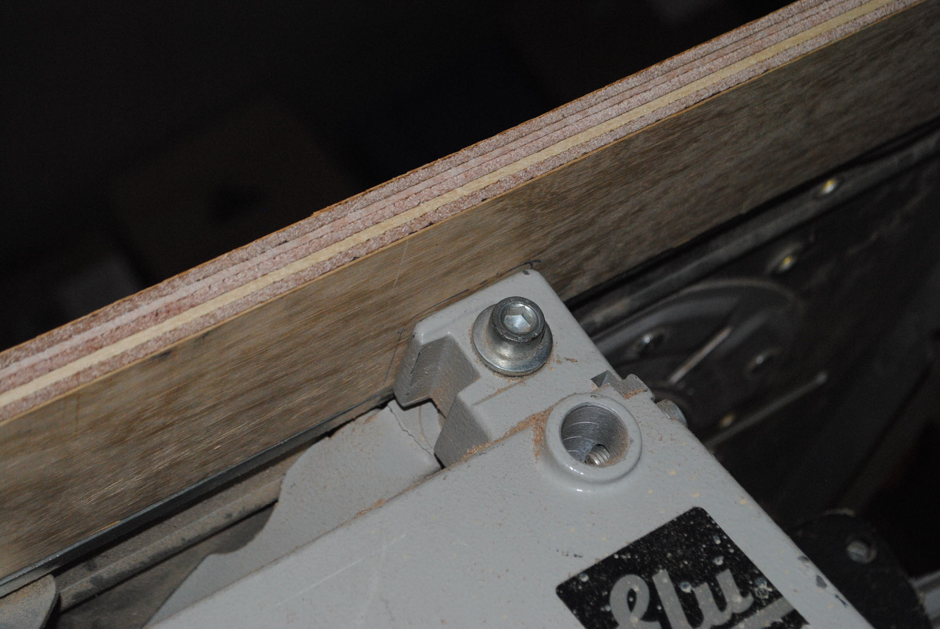 On top of the frame I laminated a large piece of 8mm multiplex. This forms the surface of the table, and the slide runs against its sides. Therefore it is important that this piece is precisely oriented to be square with the blade.