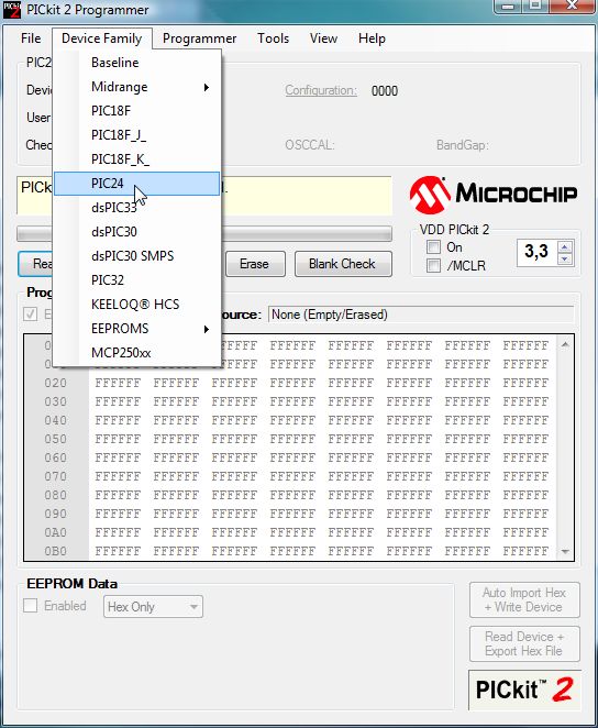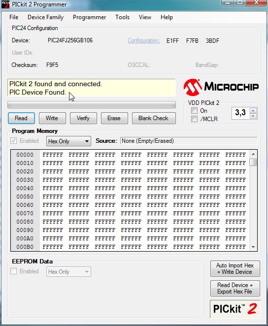If this works then the application will show PIC Device Found. in it’s status window. The PICkit3 contains a PIC24FJ256GB106 device.