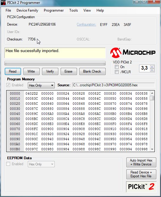The firmware should now be loaded into the programming application, as witnessed by the text Hex file sucessfully imported. Its checksum should be 77D6.
