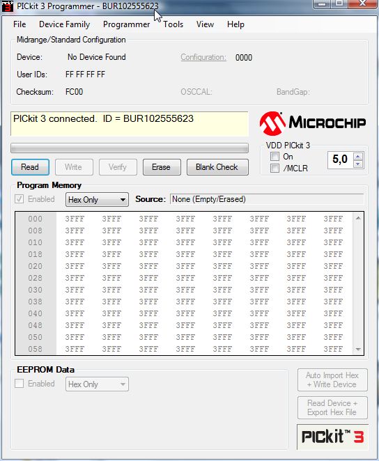 Now connect the unbricked PICkit3 to the USB cable and fire up the PICkit3 v3 Programmer application. It should detect the PICkit3 and show its ID. Since this is the application that bricked my PICkit3, I will leave it alone.