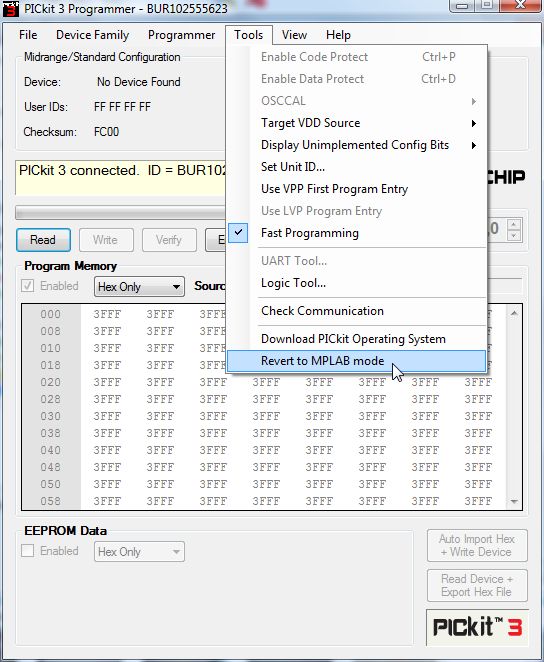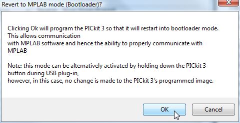 But first we’ll need to revert the firmware back to MPLAB mode so MPLAB can talk to the PICkit3.