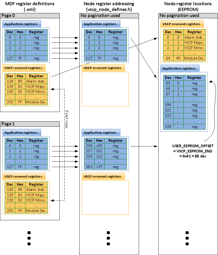 Each register has two properties that address the register, the page and the offset. The page describes on which register page the register is placed. Each page can hold 256 registers (0 - 254 decimal). The first 128 registers on each page, 0 - 127 decimal, are used for application registers. The next 128 registers, 128 - 254 decimal, hold the VSCP reserved registers. So every page holds 128 application and 128 reserved registers. One specific quirk of the addressing scheme which is worth mentioning, is that there are only 128 reserved registers and that they are simply duplicated on each page. So for example reading page 6 registers 127 to 254 will yield the same results as reading page 0 registers 127 to 254.